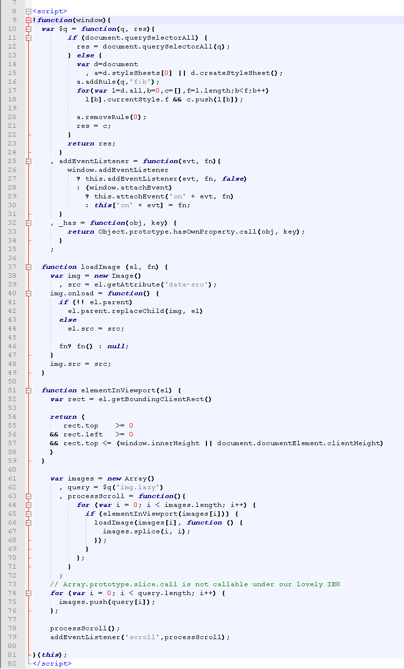 برای LazyLoading در وب سایت انواع مختلفی وجود دارد و دارای کدهای مختلفی می باشند که یک مورد در ذیل آمده است: باید در ابتدا یک قطعه کد Jquery مربوط به LazyLoading درون سایت قرار بگیرد که شامل کد ذیل است:
